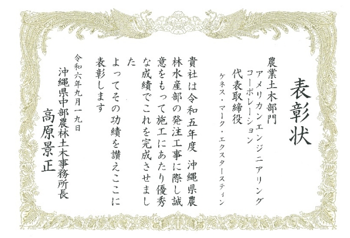 アメリカンエンジニアリングコーポレーション(AEC)は、2024 年 9 月 19 日に沖縄県農林水産部中部農林土木事務所より、優良建設業者として表彰されました。