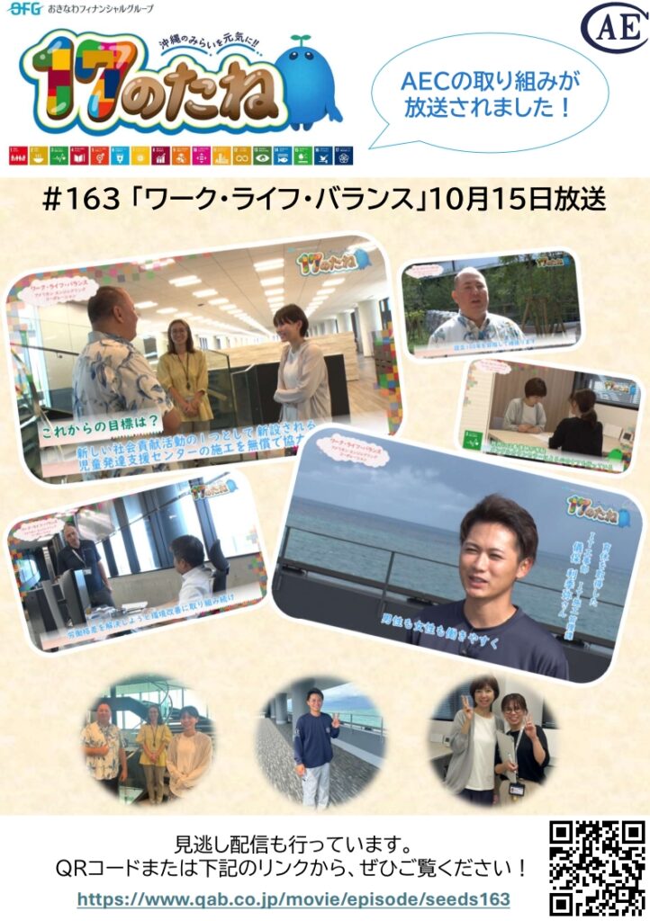 お知らせ 2024.10.15 琉球朝日放送「17のたね」 AECの取り組みが放送されました! 17のたね「ワーク・ライフ・バランス」10月15日放送 #163「ワーク・ライフ・バランス」 – Quebee キュエビー