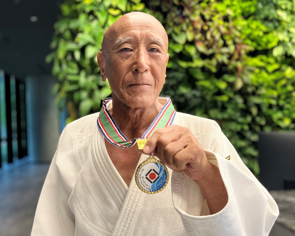 2025 年 6 月、鹿児島県で開催された「2025 年日本ベテランズ国際柔道大会」で、70~74 歳・60キロ級において、AEC の技術者、粟國謙次さん(70 歳)が、初出場・初優勝という快挙を成し遂げました!