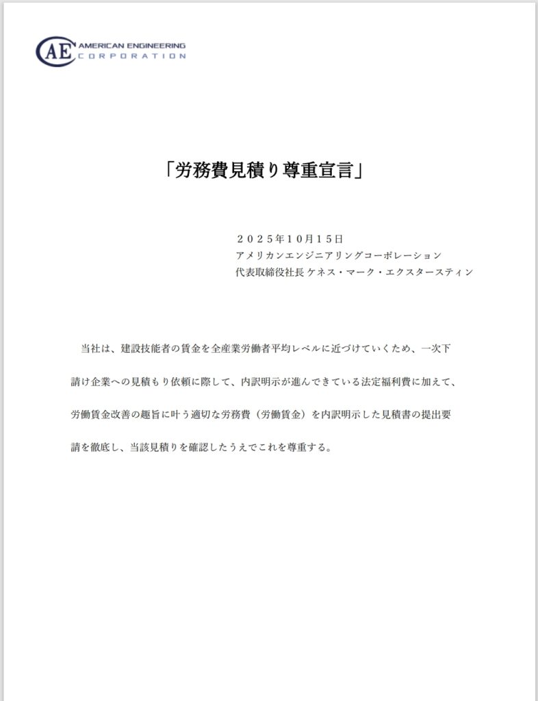 当社は、建設技能者の賃金を全産業労働者平均レベルに近づけていくため、一次下請け企業への見積もり依頼に際して、内訳明示が進んできている法定福利費に加えて、労働賃金改善の趣旨に叶う適切な労務費(労働賃金)を内訳明示した見積書の提出要請を徹底し、当該見積りを確認したうえでこれを尊重する。